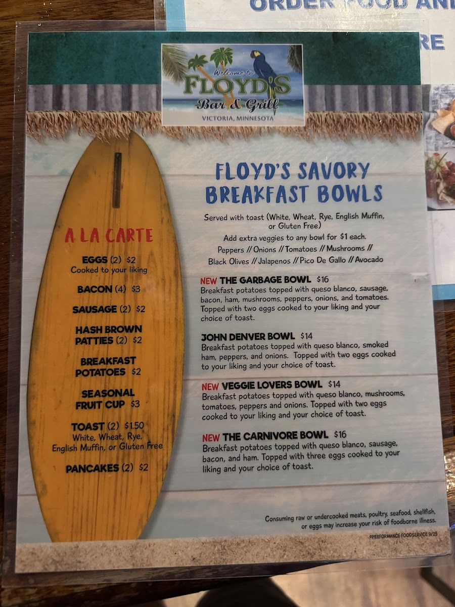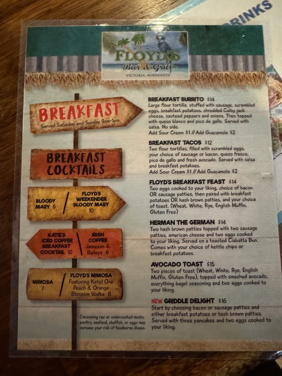 Beverages: The drink selection includes a variety of cocktails and beers, featuring items such as Bloody Mary, the specialty "Weekender" Bloody Mary, Irish Coffee, Corona, and Ummmm Beer. Specific drinks like Pina Colada and French Lady are available on Fridays.
